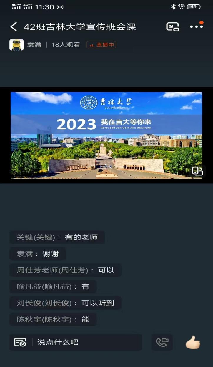 志愿者们积极运用学校招生办给同学们提供的宣发资料,PPT以及视频,再结合同学们这一学期在吉林大学的所见所闻,鼓励同学们在2023年高考后积极报考吉林大学。本次互动时正值疫情严重时期,大部分已回家,所以采用线上钉钉授课模式,未回家的同学们在教室中由班主任带领统一观看多媒体。