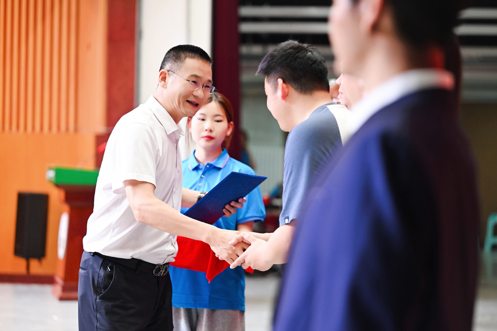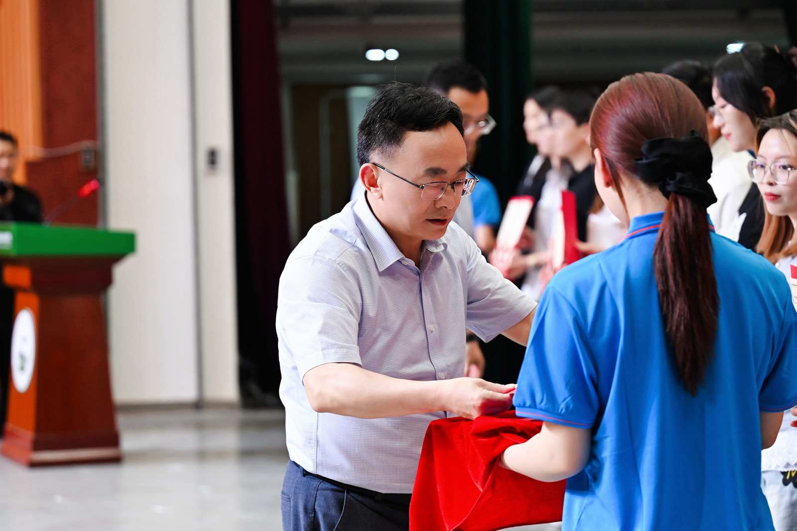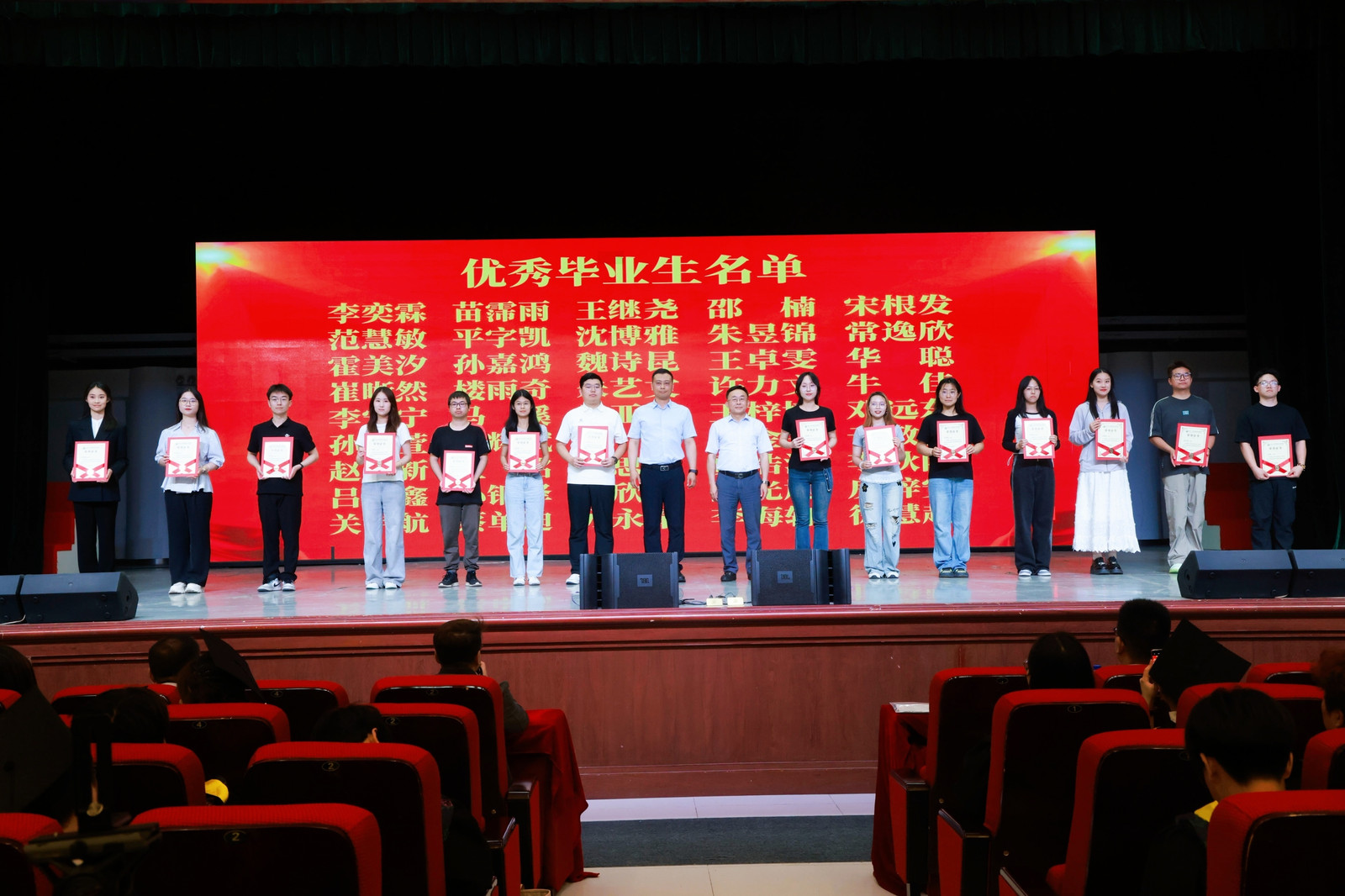 典礼在庄严的国歌声中拉开序幕。副院长张文静宣读《关于表彰bat365官网登录入口2025届优秀毕业生的决定》,院长董双石、党委书记汪祥松为45名优秀毕业生代表颁奖。