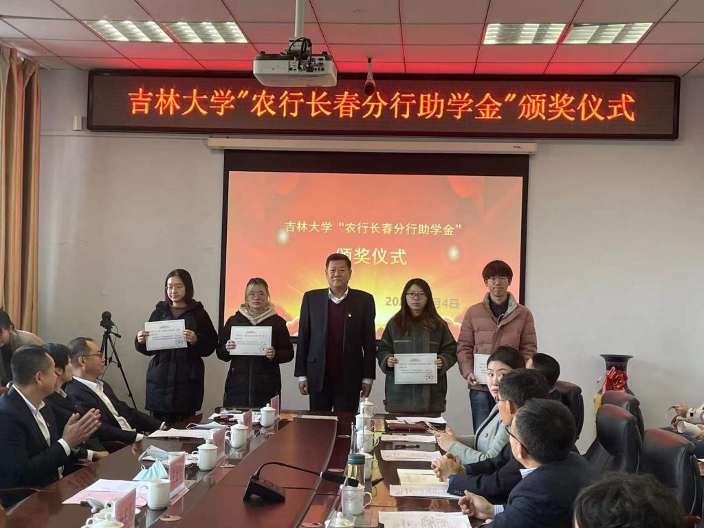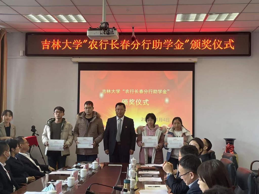 中国农业银行股份有限公司长春分行向我院捐赠助学金10万元,设立吉林大学“农行长春分行助学金”,用于奖励学院家庭贫困且品学兼优的大学生。2022年1月4日上午11:00,吉林大学“农行长春分行助学金”颁奖仪式在吉林大学前卫北区理化楼260会议室举行。农行吉林省分行党委委员、副行长兼长春分行党委书记、行长王金山,农行长春分行党委委员、副行长李韩鹏,农行长春分行党委委员、副行长韩宪军,农行长春分行机构业务部总经理鲍秋颖,农行长春分行网金科技部总经理李云鑫,农行长春分行办公室主任王春卿,农行长春高新支行行长张鹏,bat365官网登录入口院长许天福、党委书记汪祥松等学院班子成员及获奖学生参加了颁奖仪式。