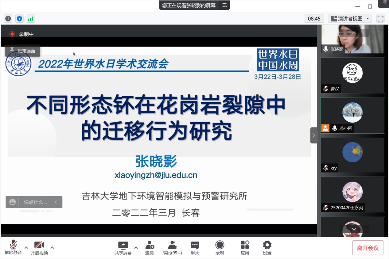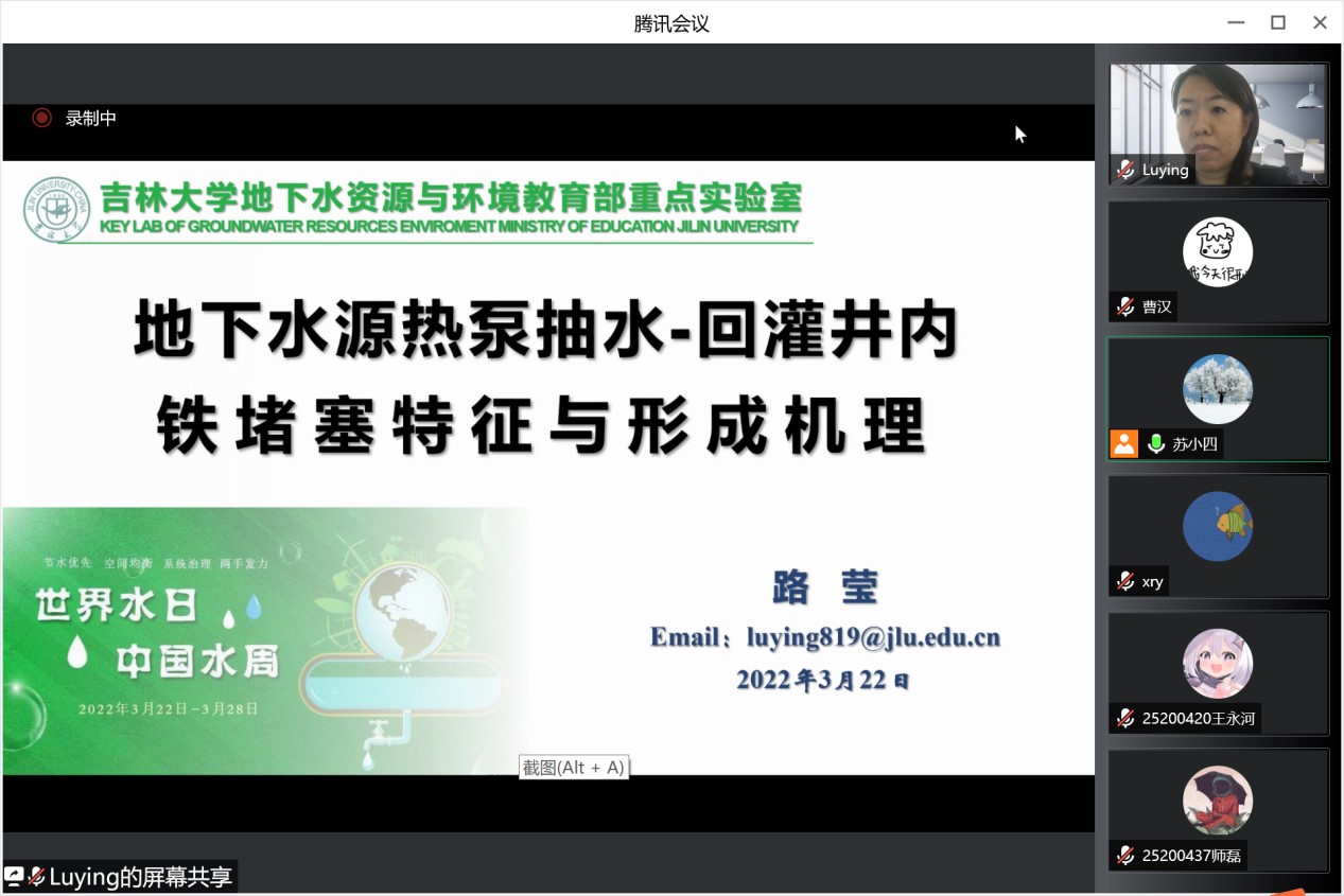 会议开始,地下水资源与环境教育部重点实验室主任、bat365官网登录入口院长许天福教授简要回顾了世界水日的由来和主旨,重点介绍了2022年世界水日和中国水周的活动主题。其后,王福刚教授、冯右骖副教授、吕航副教授、吕颖副教授、张晓影副教授、王宇博士和路莹副教授等7位中重点实验室青年骨干教师围绕寒旱区地下水资源形成与评价、包气带水分运动与污染质迁移转化、花岗岩裂隙中核素迁移、城市海绵城市雨洪过程和流域非点源污染过程模拟、地下水人工补给等主题汇报了各自近年来取得的最新进展,与参会师生进行了积极互动和深入交流。最后,苏小四教授对本次学术交流活动进行了总结。