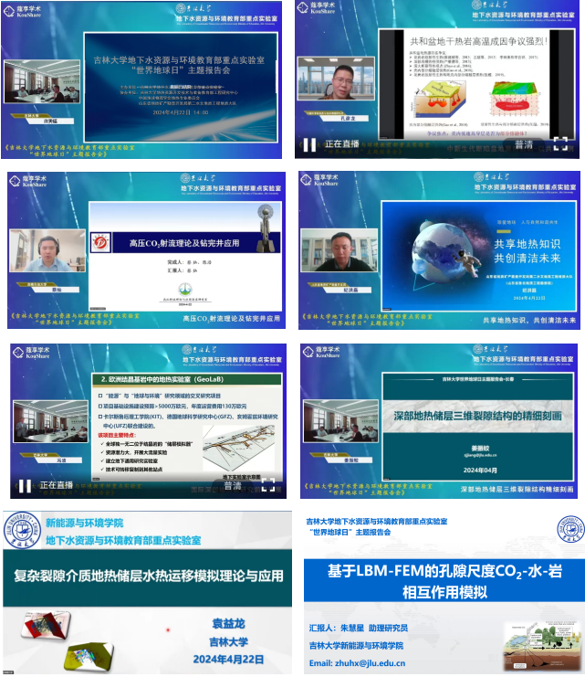 2024年4月22日是第55个“世界地球日”,主题为“全球战塑”(Planet vs. Plastics)。今年的世界地球日主题报告会活动由“地下水资源与环境教育部重点实验室主办,吉林大学地热资源开发技术与装备教育部工程研究中心、山东省地质矿产勘查开发局第二水文地质工程地质大队、滨州市自然资源和规划局、中国地球物理学会地热专业委员会联合协办”,蔻享学术网络平台提供直博服务。报告主题围绕应对全球气候变化的国际关注热点问题,分别从绿色能源-地热能开发,以及二氧化碳减排地质封存两方面进行科普宣讲和学术研讨。会议由地下水资源与环境教育部重点实验室副主任王福刚教授主持,重点实验室成员及研究生50余人线下参加此次学术交流活动,6000余人通过“蔻享学术”平台直播观看了此次报告会。