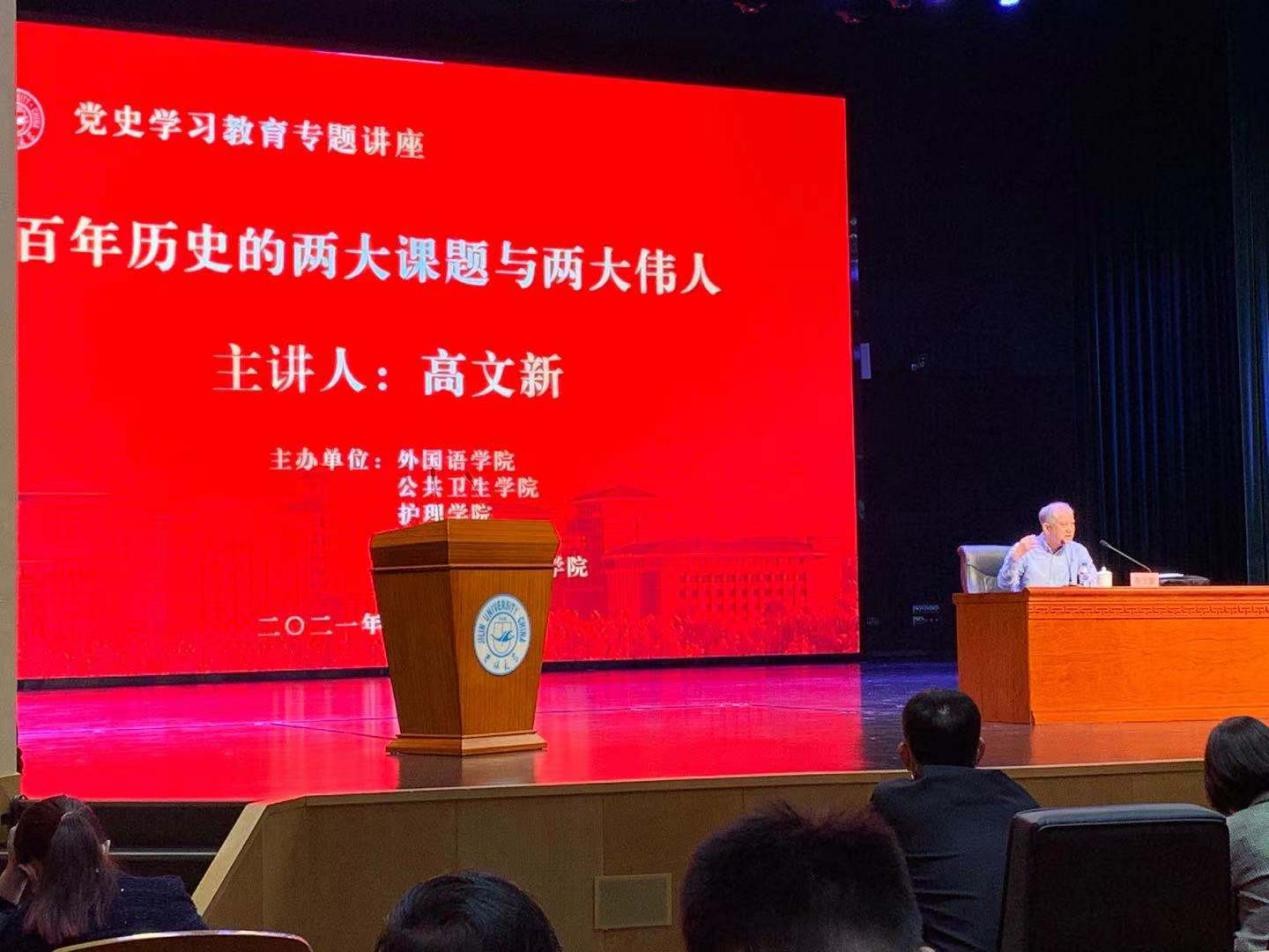 2021年5月25日下午,在吉林大学中心校区鼎新大讲堂,由吉林大学外国语学院、公共卫生学院、护理学院与bat365官网登录入口联合主办了党史学习教育专题讲座,由吉林大学马克思主义学院教授、博士生导师高文新老师讲授,高文新教授先后被评为优秀教师,吉林省教育系统师德标兵和师德先进个人,多次获省、校科研成果奖和学校教学奖,本次讲授主题为“百年历史的两大课题与两大伟人”。