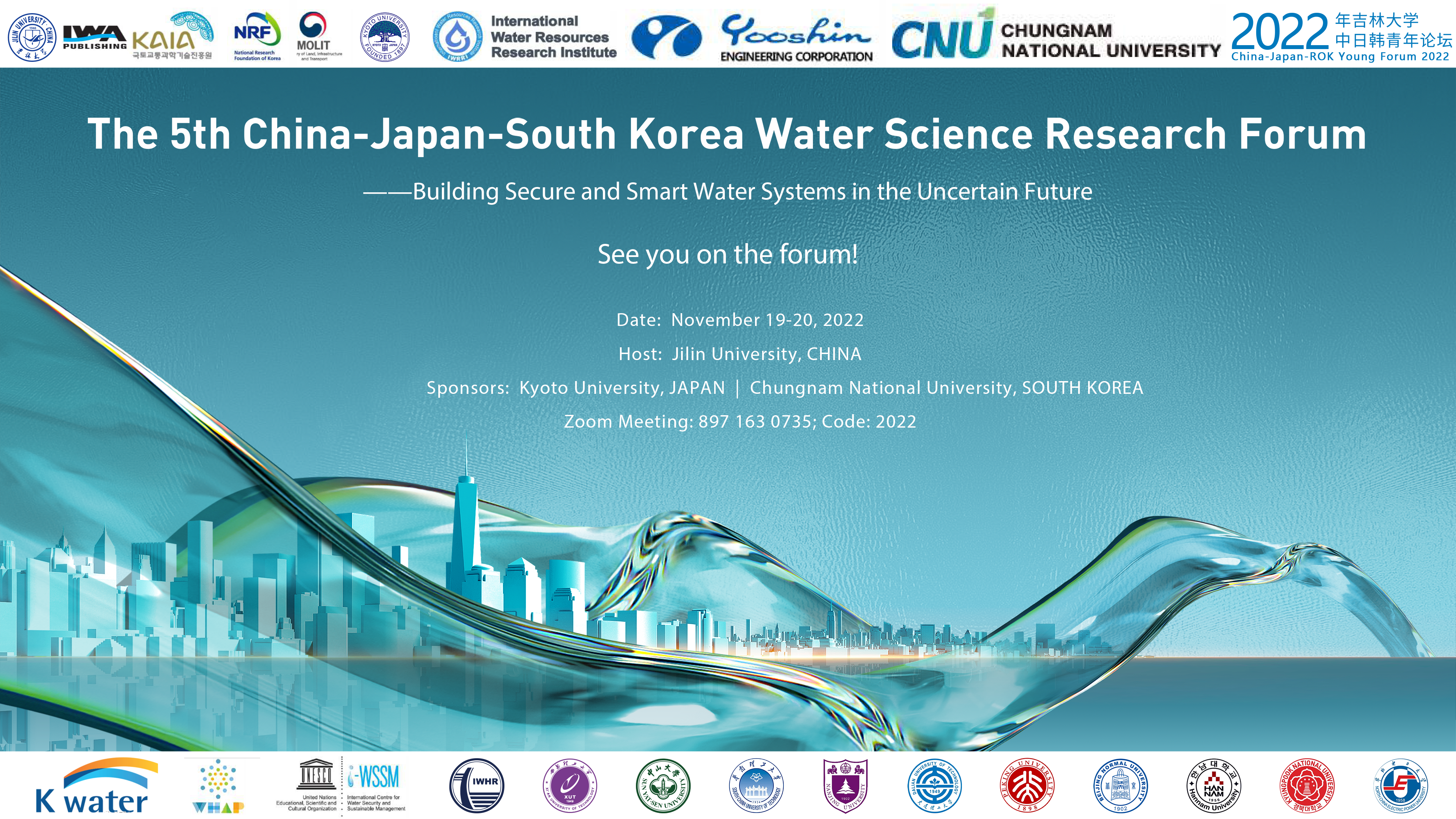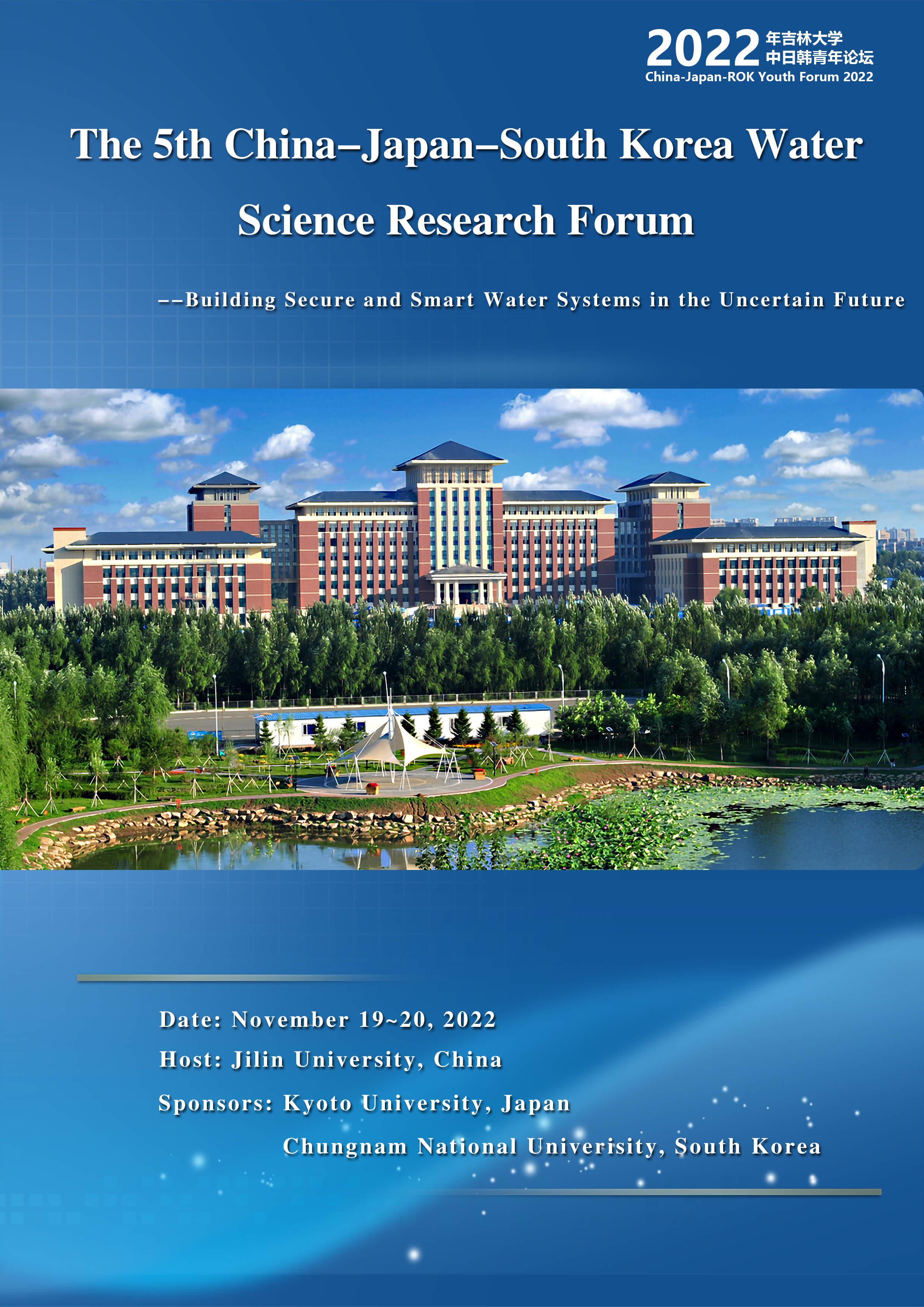 The 5th China-Japan-South Korea Water Science Research Forum, as a part of 2022 China-Japan-South Korea Forum of Jilin University, will be held online by the College of New Energy and Environment at Jilin University on November 19-20, 2022.