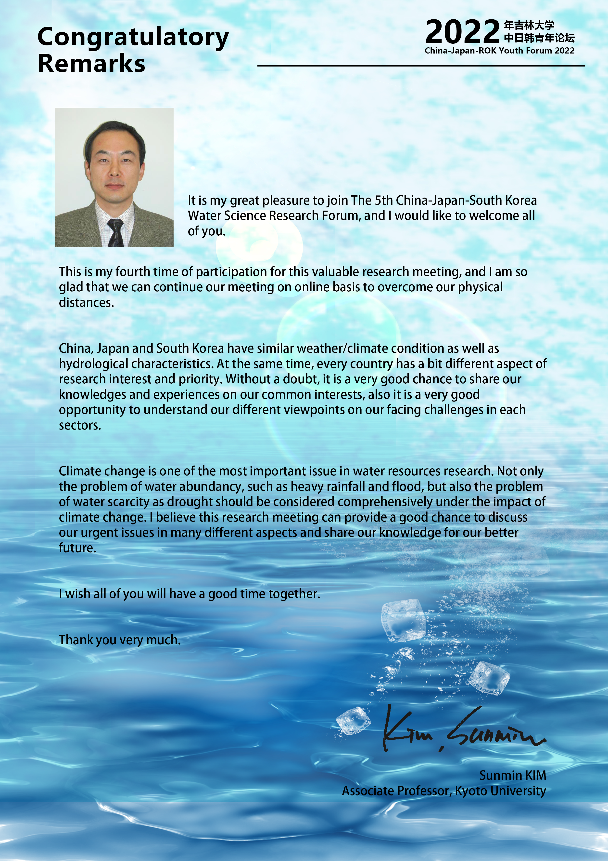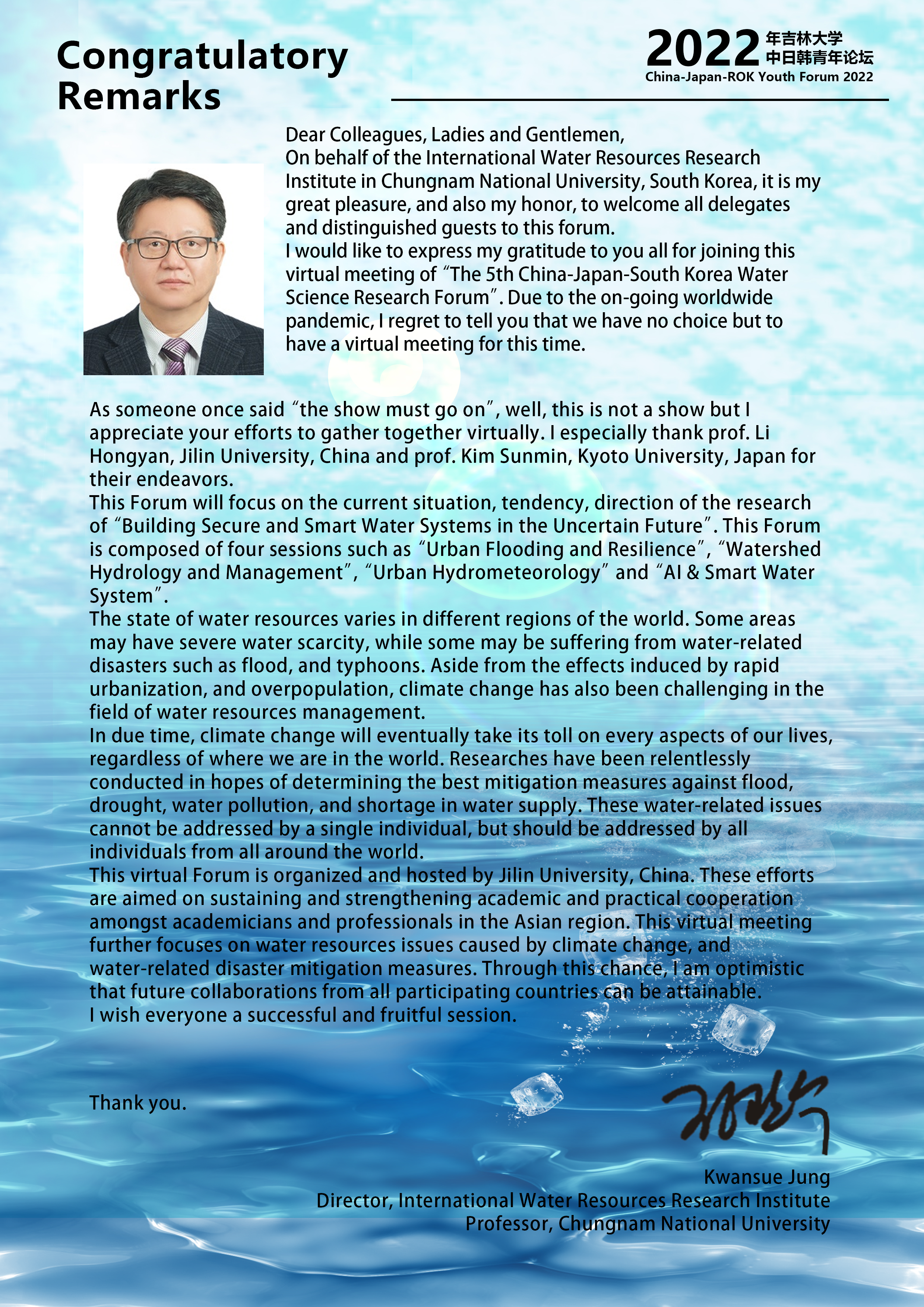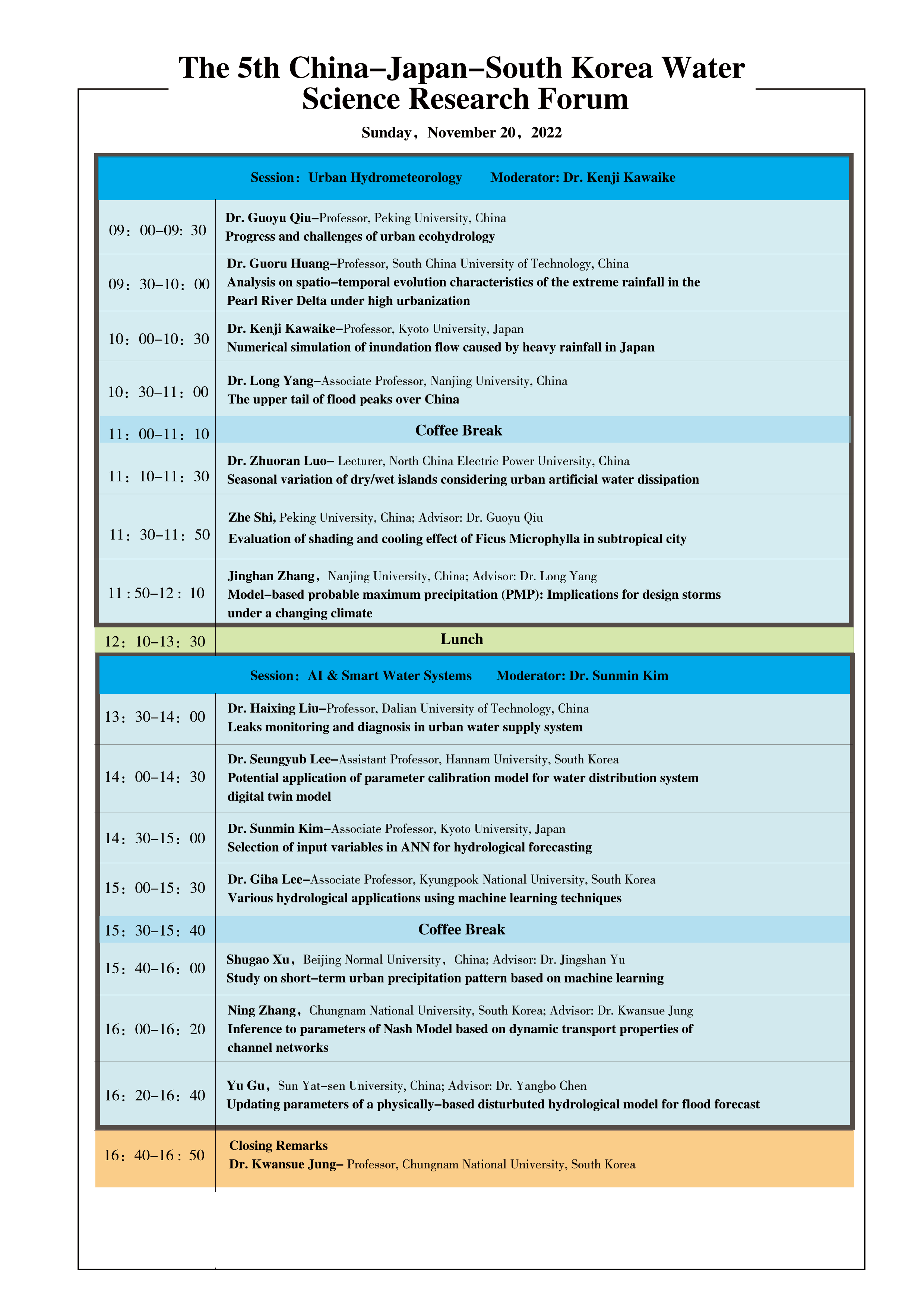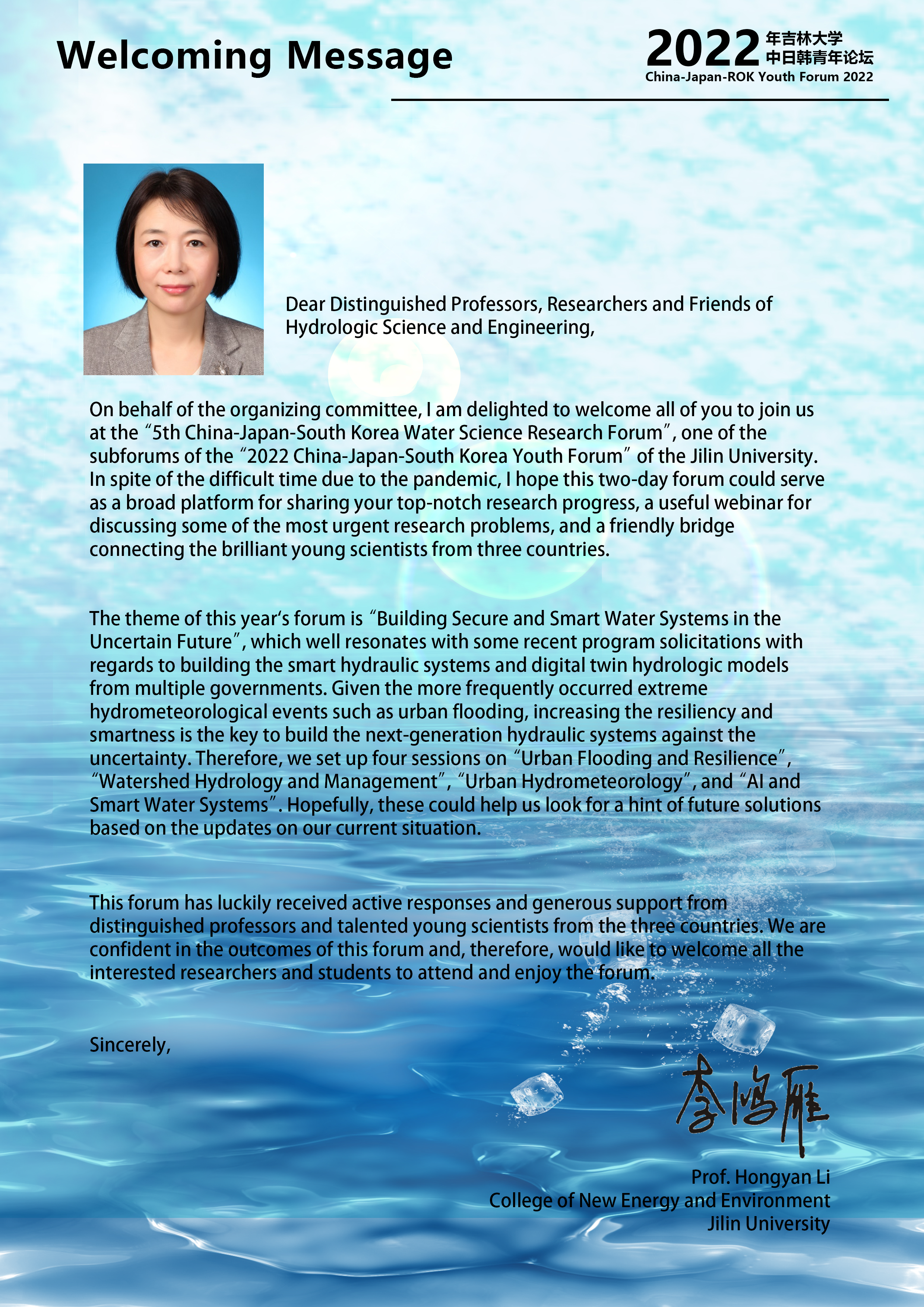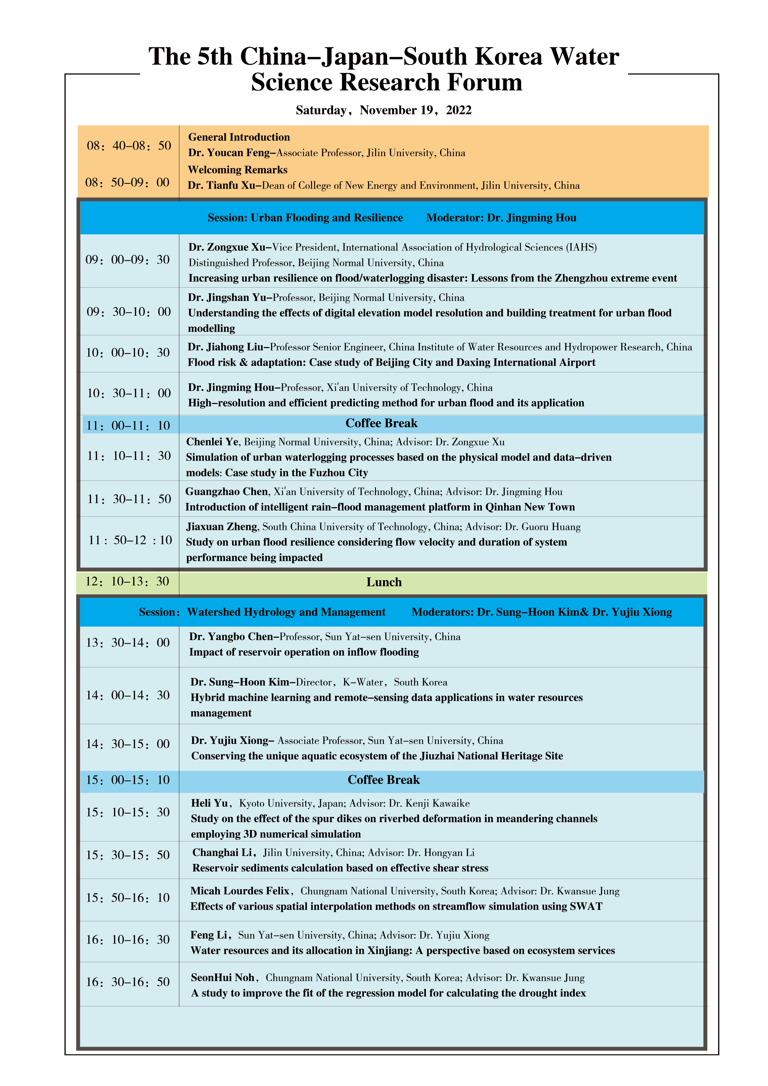 The theme of this year is “Building Secure and Smart Water Systems in the Uncertain Future”, with four sessions as “Urban Flooding and Resilience”, “Watershed Hydrology and Management”, “Urban Hydrometeorology”, and “AI and Smart Water Systems”. We hope that this two-day forum could serve as a broad platform for sharing and discussing the regional research advances in water science, and could also maintain the bridge of  friendship through the pandemic that connects  talented young scientists from the three countries.